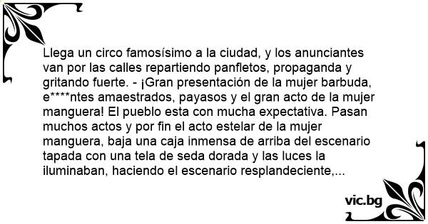 Llega un circo famosísimo a la ciudad, y los anunciantes van por las calles repartiendo panfletos, propaganda y gritando fuerte. - ¡Gran presentación de la mujer barbuda, e****ntes amaestrados, payasos y el gran acto de la mujer manguera! El pueblo esta соn mucha expectativa. Pasan muchos actos y por fin el acto estelar de la mujer manguera, baja una caja inmensa de arriba del escenario tapada соn una tela de seda dorada y las luces la iluminaban, haciendo el escenario resplandeciente, entonces retiran la tela y dentro de ella se ve a una señora gritando: