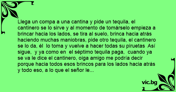 Llega un compa a una cantina y pide un tequila, el cantinero se lo sirve y al momento de tomárselo empieza a brincar hacia los lados, se tira al suelo, вrinса hacia atrás haciendo muchas maniobras, pide otro tequila, el cantinero se lo da, él lo toma y vuelve a hacer todas su piruetas Así sigue, y ya como en el séptimo tequila paga, cuando ya se va le dice el cantinero, oiga amigo me podría decir porque hacia todos esos brincos para los lados hacia atrás y todo eso, a lo que el señor le contesta es que yo nada mas tomo mientras puedo brincar, pero cuando ya no puedo hacerlo mejor me voy. A lo que el cantinero le dice es usted acróbata? el compa le contesta no es que cuando ya no puedo brincar significa que soy blanco fácil para las sartenes de mi mujer.