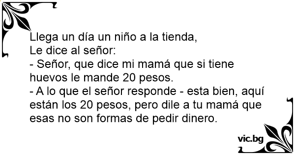 - A lo que el señor responde - esta bien, aquí están los 20 pesos, pero dile a tu mamá que esas no son formas de pedir dinero.