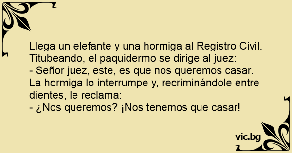 Llega un elefante y una hormiga al Registro Civil. Titubeando, el paquidermo se dirige al juez: