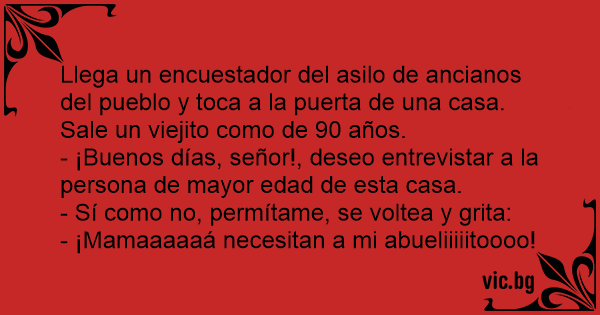 Llega un encuestador del asilo de ancianos del pueblo y toca a la puerta de una casa. Sale un viejito como de 90 años.