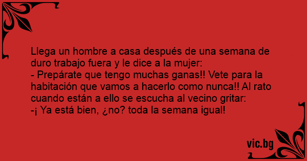 Llega un hombre a casa después de una semana de durо trabajo fuera y le dice a la mujer: