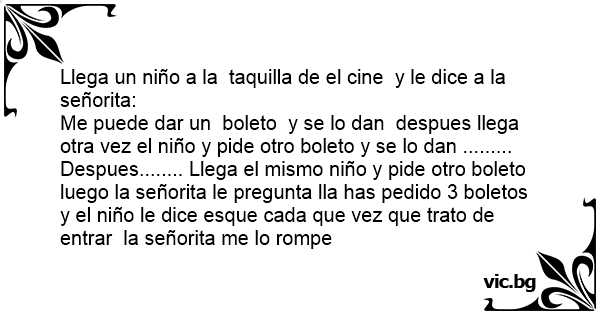 Me puede dar un boleto y se lo dan despues llega otra vez el niño y pide otro boleto y se lo dan ......... Despues........ Llega el mismo niño y pide otro boleto luego la señorita le pregunta lla has pedido 3 boletos y el niño le dice esque cada que vez que trato de entrar la señorita me lo rompe