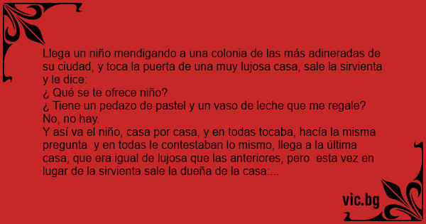 Llega un niño mendigando a una colonia de las más adineradas de su ciudad, y toca la puerta de una muy lujosa casa, sale la sirvienta y le dice: