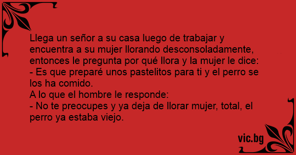 Llega un señor a su casa luego de trabajar y encuentra a su mujer llorando desconsoladamente, entonces le pregunta por qué llora y la mujer le dice: