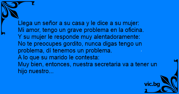 Marido chega preocupado em casa e diz a esposa: — Tenho um problema no serviço. Esposa: — Não diz tenho um problema, diga temos um problema porque os teus problemas são meus também. Marido: — Tá bem, temos um problema no serviço, a nossa secretária vai ter um filho nosso.