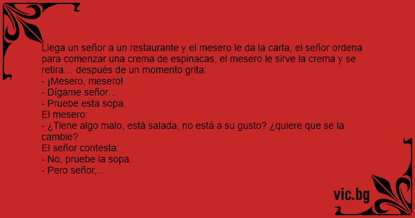 Llega un señor a un restaurante y el mesero le da la carta, el señor ordena para comenzar una crema de espinacas, el mesero le sirve la crema y se retira… después de un momento grita: