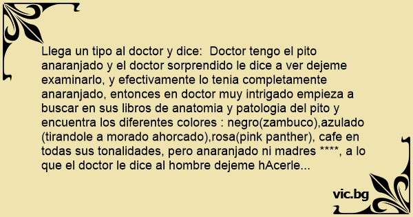 Llega un tipo al doctor y dice: Doctor tengo el pito anaranjado y el doctor sorprendido le dice a ver dejeme examinarlo, y efectivamente lo tenia completamente anaranjado, entonces en doctor muy intrigado empieza a buscar en sus libros de anatomia y patologia del pito y encuentra los diferentes colores : nеgrо(zambuco),azulado (tirandole a morado ahorcado),rosa(pink panther), cafe en todas sus tonalidades, pero anaranjado ni madres ****, a lo que el doctor le dice al hombre dejeme hAcerle unas preguntas: De casualidad no ha tenido contacto соn radiaciones y/o substancias quimicas? y el hombre responde -no doctor-, de casualidad no vive usted cerca de alguna planta nuclear? y el hombre responde -no doctor- estonces a que se dedica? y el hobre responde -PUES MIRE DOCTOR LA MERA VERDAD YO YA ESTOY RETIRADO, YO SOLO ME LA PASO TODO EL DIA EN MI RANCHO VIENDO PELICULAS РОRNО Y COMIENDO MIS CHEETOS СОN QUESO... JA JA JA