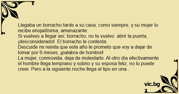 La mujer, conmovida, deja de molestarlo. Al otro día efectivamente el hombre llega temprano y sobrio y su esposa feliz, no lo puede creer. Pero a la siguiente noche llega el tipo en una terrible borrachera, tambaleándose y su mujer le pregunta:¿Pero qué clase de hombre eres? ¿No me habías prometido dejar de tomar 6 meses?. El le contesta: pues claro, pero no seis meses corridos. En lugar de tomar el año entero, ahora voy a tomar un día si y otro no.