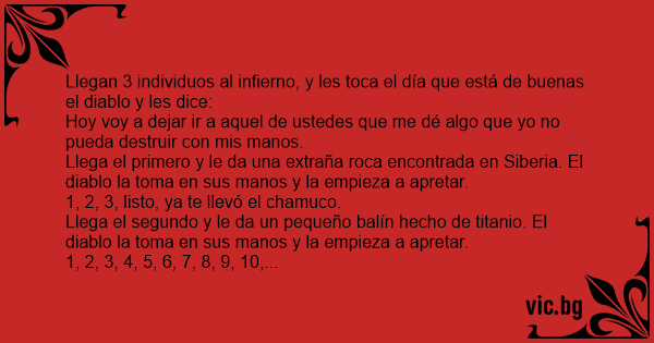 Llegan 3 individuos al infierno, y les toca el día que está de buenas el diablo y les dice: