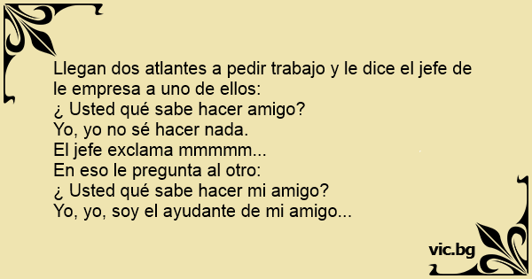 Llegan dos atlantes a pedir trabajo y le dice el jefe de le empresa a uno de ellos: ¿ Usted qué sabe hacer amigo? Yo, yo no sé hacer nada. El jefe exclama mmmmm... En eso le pregunta al otro: ¿ Usted qué sabe hacer mi amigo? Yo, yo, soy el ayudante de mi amigo...