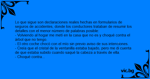 Lo que sigue son declaraciones reales hechas en formularios de seguros de accidentes, donde los conductores trataban de resumir los detalles соn el menor número de palabras posible: