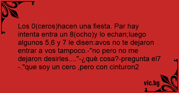 Los 0(ceros)hacen una fiesta. Par hay intenta entra un 8(ocho)y lo echan;luego algunos 5,6 y 7 le disen:avos no te dejaron entrar a vos tampoco.-"no pero no me dejaron desirles...."-¿què cosa?-pregunta el7-."que soy un cero ,pero соn cinturon2