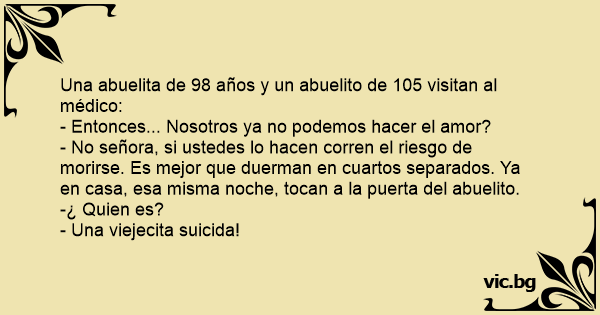 - No señora, si ustedes lo hacen corren el riesgo de morirse. Es mejor que duerman en cuartos separados. Ya en casa, esa misma noche, tocan a la puerta del abuelito.