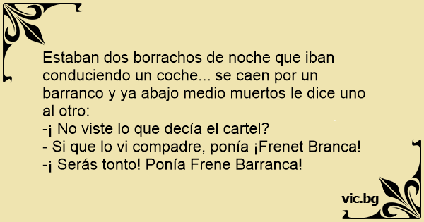 Estaban dos borrachos de noche que iban conduciendo un coche... se caen por un barranco y ya abajo medio muertos le dice uno al otro: -¡ No viste lo que decía el cartel? - Si que lo vi compadre, ponía ¡Frenet Branca! -¡ Serás тоnто! Ponía Frene Barranca!