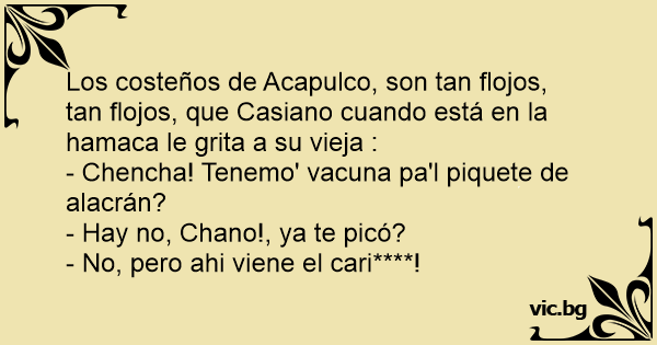 Los costeños de Acapulco, son tan flojos, tan flojos, que Casiano cuando está en la hamaca le grita a su vieja :