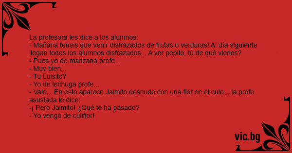 - Mañana teneis que venir disfrazados de frutas o verduras! Al día siguiente llegan todos los alumnos disfrazados... A ver pepito, tú de qué vienes?
