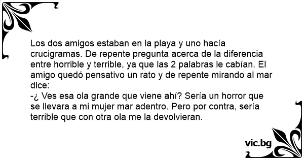Los dos amigos estaban en la playa y uno hacía crucigramas. De repente pregunta acerca de la diferencia entre horrible y terrible, ya que las 2 palabras le cabían. El amigo quedó pensativo un rato y de repente mirando al mar dice: