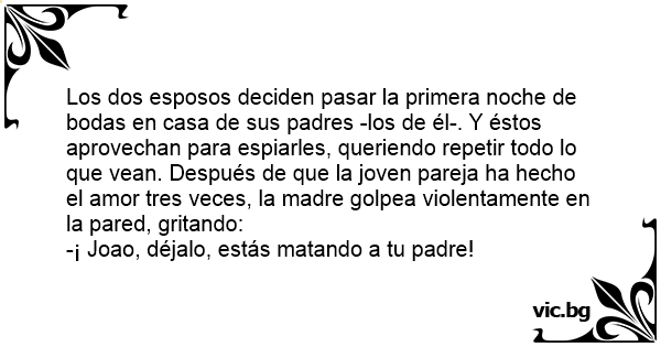 Los dos esposos deciden pasar la primera noche de bodas en casa de sus padres -los de él-. Y éstos aprovechan para espiarles, queriendo repetir todo lo que vean. Después de que la joven pareja ha hecho el amor tres veces, la madre golpea violentamente en la pared, gritando: