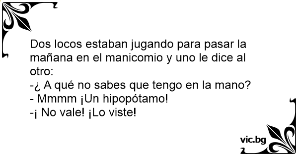 Dos locos estaban jugando para pasar la mañana en el manicomio y uno le dice al otro:<br />-¿ A qué no sabes que tengo en la mano?<br />- Mmmm ¡Un hipopótamo!<br />-¡ No vale! ¡Lo viste!