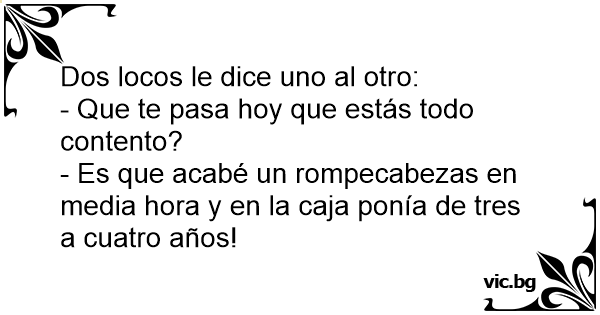 Un mexicano platicaba con un atlante... Le dice el atlante: Estoy feliz porque acabo de terminar mi rompe-cabezas. ¿Ah sí? ¿Y cuánto tiempo te tomó? ¡Solo un año!, dijo el atlante. ¿Tanto?,...