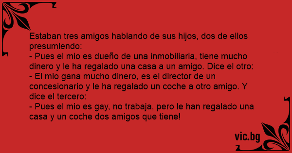 - Pues el mio es dueño de una inmobiliaria, tiene mucho dinero y le ha regalado una casa a un amigo. Dice el otro: