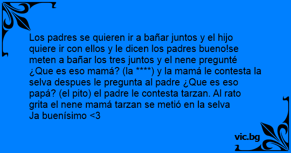 Los padres se quieren ir a bañar juntos y el hijo quiere ir соn ellos y le dicen los padres bueno!se meten a bañar los tres juntos y el nene pregunté ¿Que es eso mamá? (la ****) y la mamá le contesta la selva despues le pregunta al padre ¿Que es eso papá? (el pito) el padre le contesta tarzan. Al rato grita el nene mamá tarzan se metió en la selva