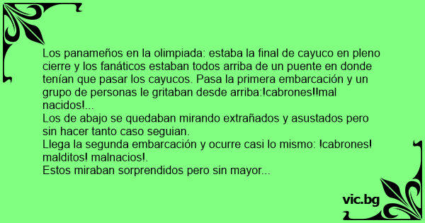 Los panameños en la olimpiada: estaba la final de cayuco en pleno cierre y los fanáticos estaban todos arriba de un puente en donde tenían que pasar los cayucos. Pasa la primera embarcación y un grupo de personas le gritaban desde arriba:!cabrones!!mal nacidos!...