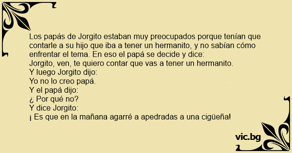 Los papás de Jorgito estaban muy preocupados porque tenían que contarle a su hijo que iba a tener un hermanito, y no sabían cómo enfrentar el tema. En eso el papá se decide y dice: