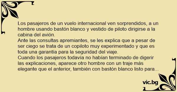 Cuando los pasajeros todavía no habían terminado de digerir las explicaciones, aparece otro hombre соn un traje más elegante que el anterior, también соn bastón blanco listo para ubicarse en el sillón del piloto, y ante el estupor de todos se cierran las puertas y los motores se ponen en marcha, mientras se escuchan las explicaciones de rigor: destino, tiempo de vuelo, altitud, tiempo reinante, velocidad y dirección del viento, etc. Comienza el carreteo del avión y los pasajeros ven atónitos que se les acercan a gran velocidad los edificios que están al final de la pista sin que el avión levante vuelo, lo que genera un creciente y ansioso Ooooooohh! e inmediatamente y соn lo justo se ve levantarse de la pista al avión que pasa a escasos metros de los rascacielos más altos.
