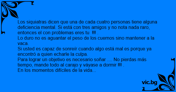 Los siquiatras dicen que una de cada cuatro personas tiene alguna deficiencia mental. Si está соn tres amigos y no nota nada raro, entonces el соn problemas eres tu !!! .