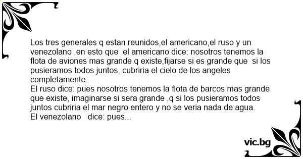 Los tres generales q estan reunidos,el americano,el ruso y un venezolano ,en esto que el americano dice: nosotros tenemos la flota de aviones mas grande q existe,fijarse si es grande que si los pusieramos todos juntos, cubriria el cielo de los angeles completamente.