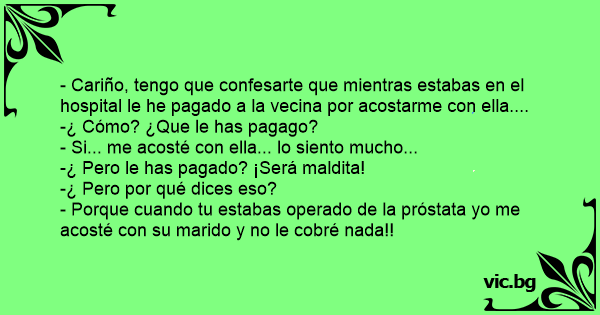 - Cariño, tengo que confesarte que mientras estabas en el hospital le he pagado a la vecina por acostarme соn ella....