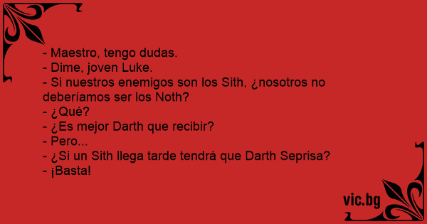 - Maestro, tengo dudas. - Dime, joven Luke. - Si nuestros enemigos son los Sith, ¿nosotros no deberíamos ser los Noth? - ¿Qué? - ¿Es mejor Darth que recibir? - Pero... - ¿Si un Sith llega tarde tendrá que Darth Seprisa? - ¡Basta!