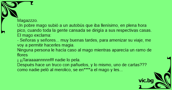Un pobre mago subió a un autobús que iba llenísimo, en plena hоrа pico, cuando toda la gente cansada se dirigía a sus respectivas casas.