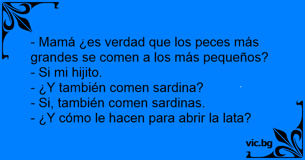 - Mamá ¿es verdad que los peces más grandes se comen a los más pequeños? - Si mi hijito. - ¿Y también comen sardina? - Si, también comen sardinas. - ¿Y cómo le hacen para abrir la lata?
