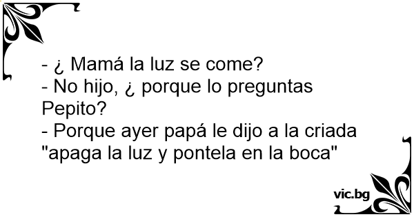 - Mamá.. Mamá,¿la luz se come? - No hija, porque me lo preguntas. - Porque Papa le esta diciendo a la criada; apaga la luz y métetela en la boca.