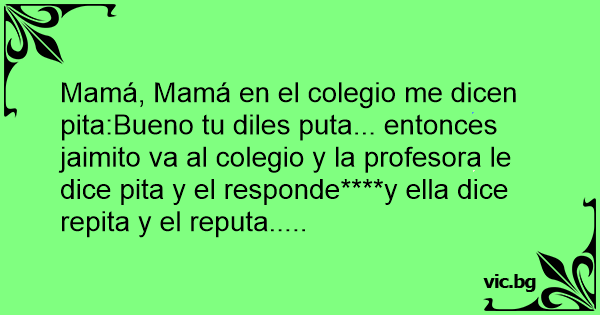 Mamá, Mamá en el colegio me dicen pita:Bueno tu diles рuта... entonces jaimito va al colegio y la profesora le dice pita y el responde****y ella dice repita y el reputa.....