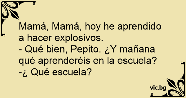 Tėvas klausia sūnaus: - Ką šiandien veikėte mokykloje? - Per chemiją studijavome sprogstamąsias medžiagas. - O ką rytoj veiksite mokykloje? - Kokioje mokykloje, tėveli…