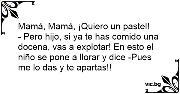 - Pero hijo, si ya te has comido una docena, vas a explotar! En esto el niño se pone a llorar y dice -Pues me lo das y te apartas!!