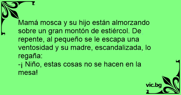 Mamá mosca y su hijo están almorzando sobre un gran montón de estiércol. De repente, al pequeño se le escapa una ventosidad y su madre, escandalizada, lo regaña: