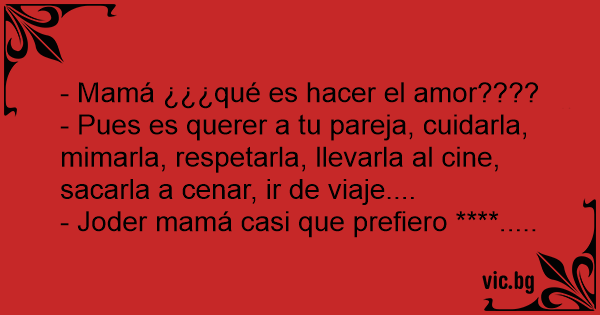 - Mamá ¿¿¿qué es hacer el amor????<br />- Pues es querer a tu pareja, cuidarla, mimarla, respetarla, llevarla al cine, sacarla a cenar, ir de viaje....<br />- Jоdеr mamá casi que prefiero ****.....