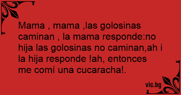 Mama , mama ,las golosinas caminan , la mama responde:no hija las golosinas no caminan,ah i la hija responde !ah, entonces me comí una cucaracha!.