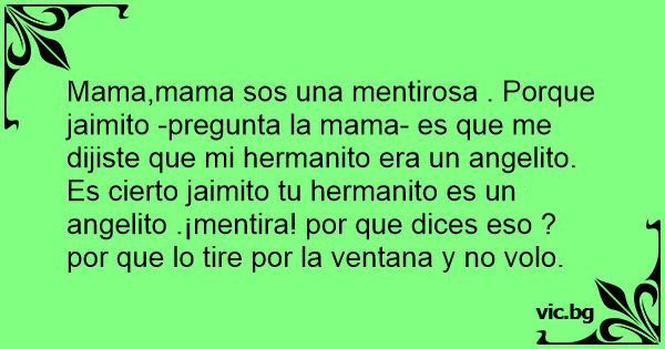 Mama,mama sos una mentirosa . Porque jaimito -pregunta la mama- es que me dijiste que mi hermanito era un angelito. Es cierto jaimito tu hermanito es un angelito .¡mentira! por que dices eso ? por que lo tire por la ventana y no volo.
