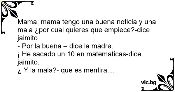 Mama, mama tengo una buena noticia y una mala ¿por cual quieres que empiece?-dice jaimito.