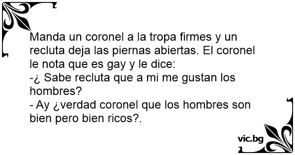 Manda un coronel a la tropa firmes y un recluta deja las piernas abiertas. El coronel le nota que es gаy y le dice: