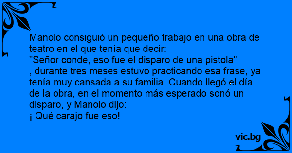 , durante tres meses estuvo practicando esa frase, ya tenía muy cansada a su familia. Cuando llegó el día de la obra, en el momento más esperado sonó un disparo, y Manolo dijo:
