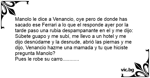 Manolo le dice a Venancio, oye pero de donde has sacado ese Ferrari a lo que el responde ayer por la tarde paso una rubia despampanante en el y me dijo: