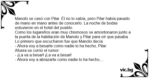 Manolo se casó соn Pilar. Él no lo sabía, pero Pilar había pasado de mano en mano antes de conocerlo. La noche de bodas estuvieron en el hotel del pueblo.