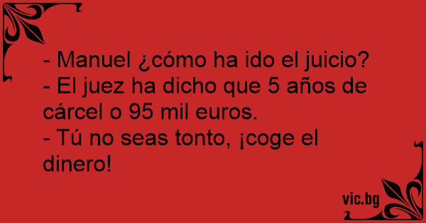 "Sie bekommen entweder 400 Euro, fünf Tage Strafdienst in einer Gemeinnützigen Einrichtung oder zehn Tage Gefängnis", stellt der Richter dem Angeklagten zur Auswahl. "Wenn Sie mich schon so fragen, Herr Richter, dann nehme ich natürlich das Geld!" Sagt der Richter zum Angeklagten: "Sie können wählen zwischen 10 Tagen Gefängnis und 1000 Euro" "Dann nehme ich natürlich das Geld!" Har du hørt om han som kunne velge mellom 3 måneders fengsel eller 10.000 kr? – Han tok pengene. Dommer i svensk rett: – Du kan velge mellom tre måneders fengsel eller 10000 kroner. – Flott, da tar jeg selvsagt pengene! A thief just out of court, and his wife calls him: - Pepe, what did they tell you? - Well, they told me that 3 years in prison or 100,000 euros. - Don't be silly Pepe, take the money ! Sale un ladrón de un juicio, acompañado por la policía y cuando van a entrar en el coche, le suena el móvil. Lo coge y pregunta: - ¿Quién es? - Manuel, soy tu mujer. ¿Cómo ha ido el juicio? - ¿El... - Domaren till norrmannen: - Ni får välja mellan böter och fängelse. Vill ni ha 3.000 kronor eller tio dagar fängelse? Norrmannen: - Solklart, jag tar pengarna. Dommeren til svensken: - Du får velge mellom bøter og fengsel. Vil du ha 3.000 kroner Eller ti dager fengsel? Svensken: - Solklart, jag tar pengarna.